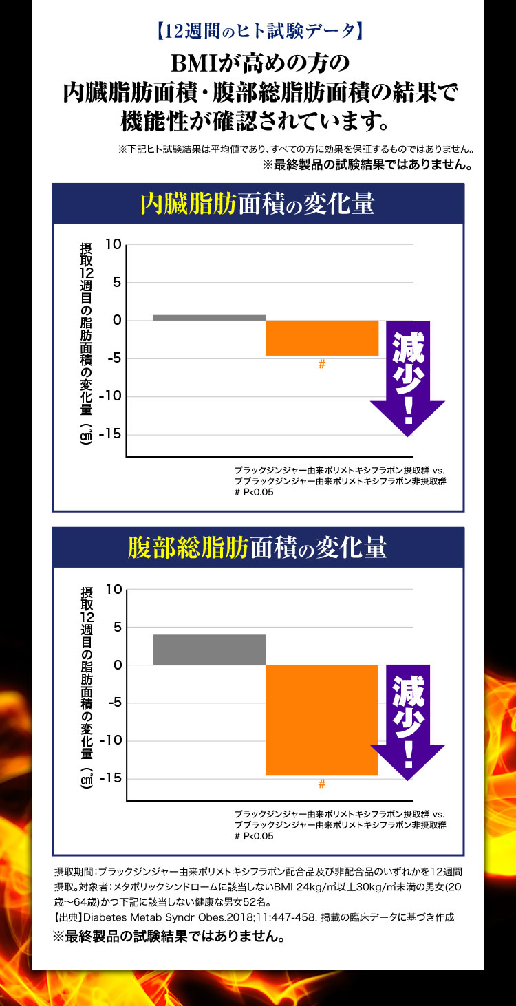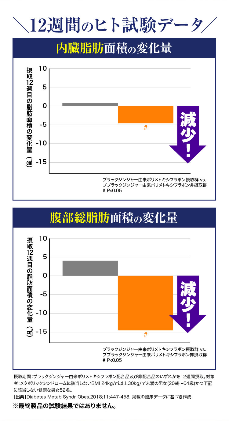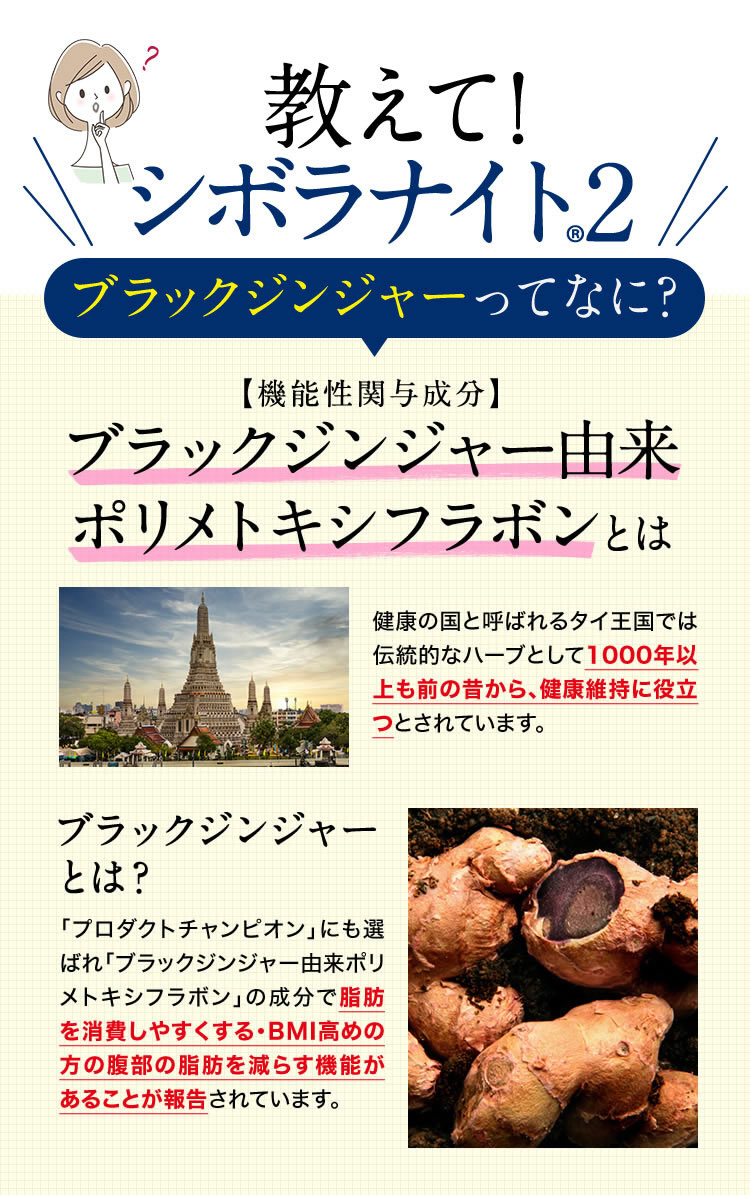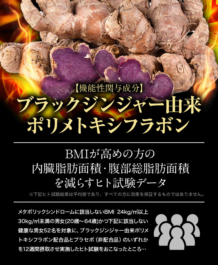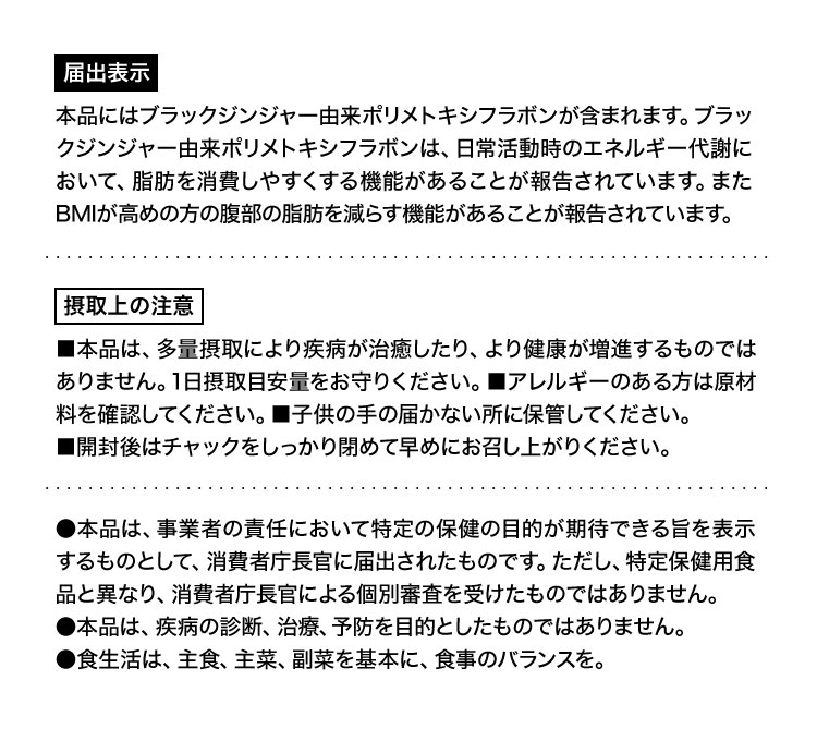 - ブラックジンジャーエキス(ブラックジンジャーエキス(国内製造)、デキストリン)、混合ハーブエキス(ドクダミ、セイヨウサンザシ、ローマンカモミール、ブドウ葉)、ギムネマシルベスタエキス、桜の花エキス/セルロース、シクロデキストリン、ステアリン酸Ca、微粒酸化ケイ素