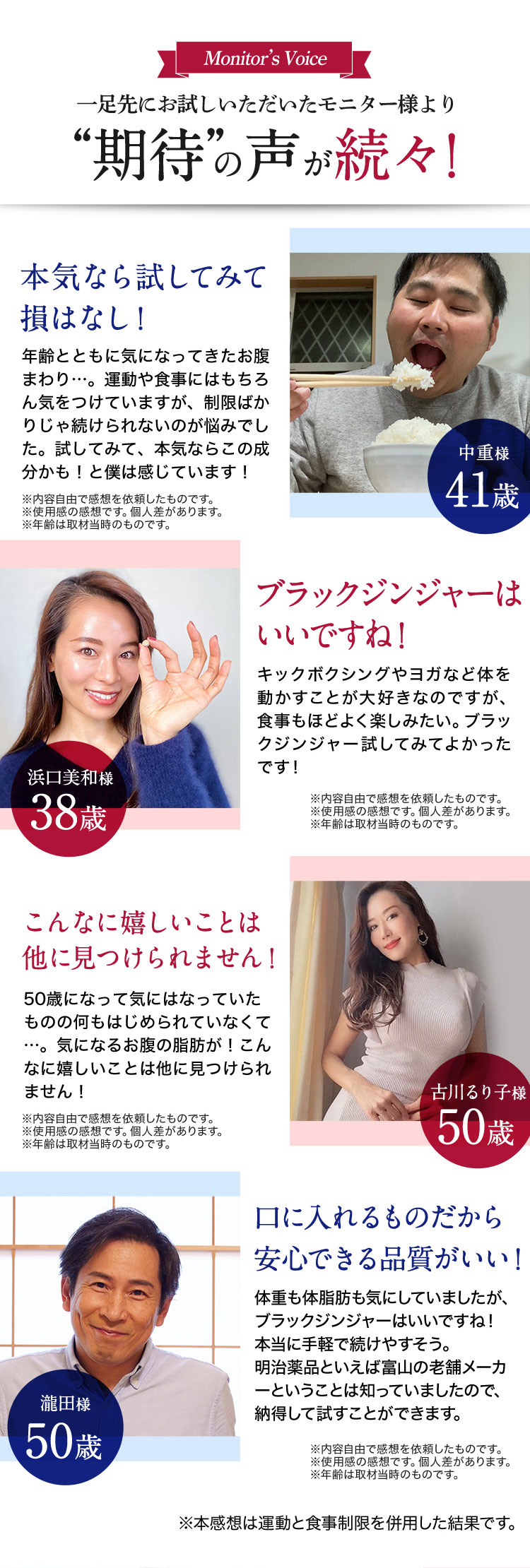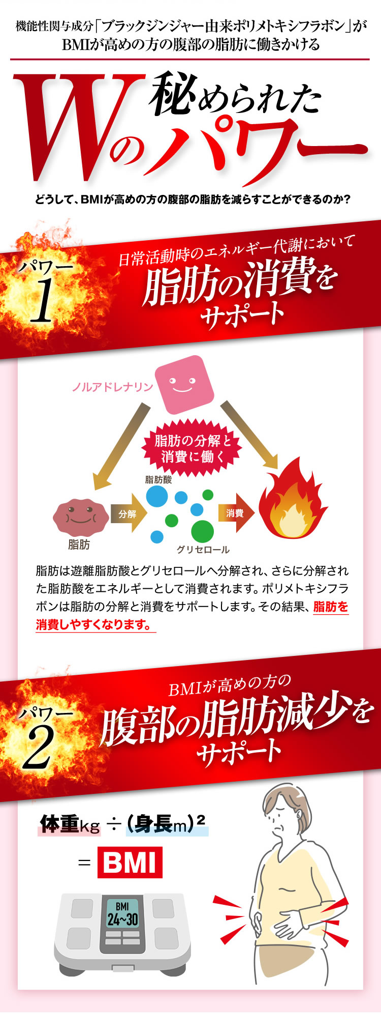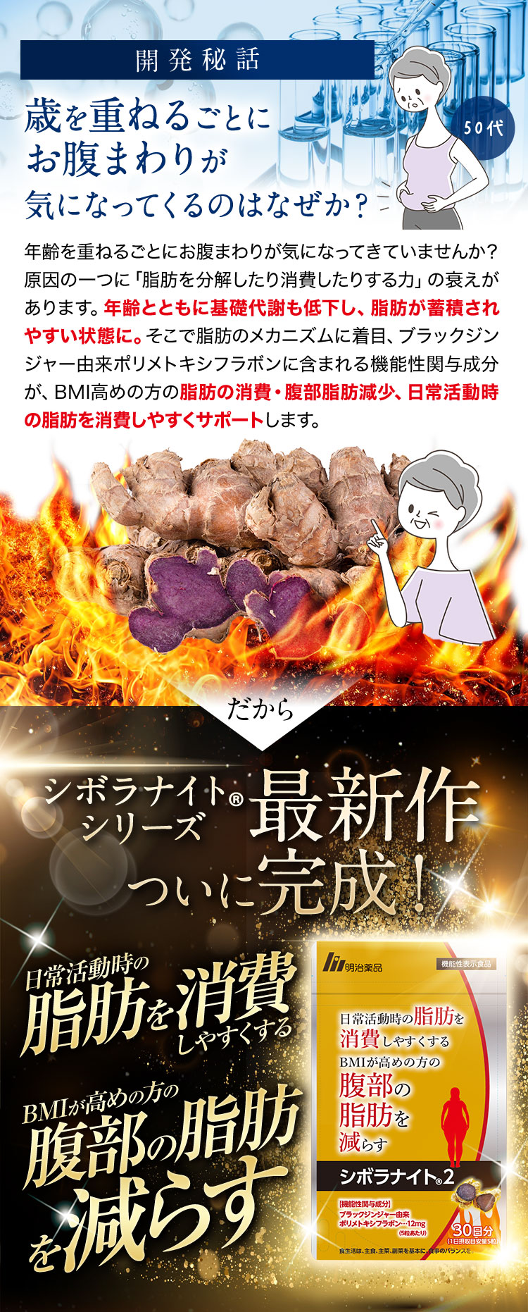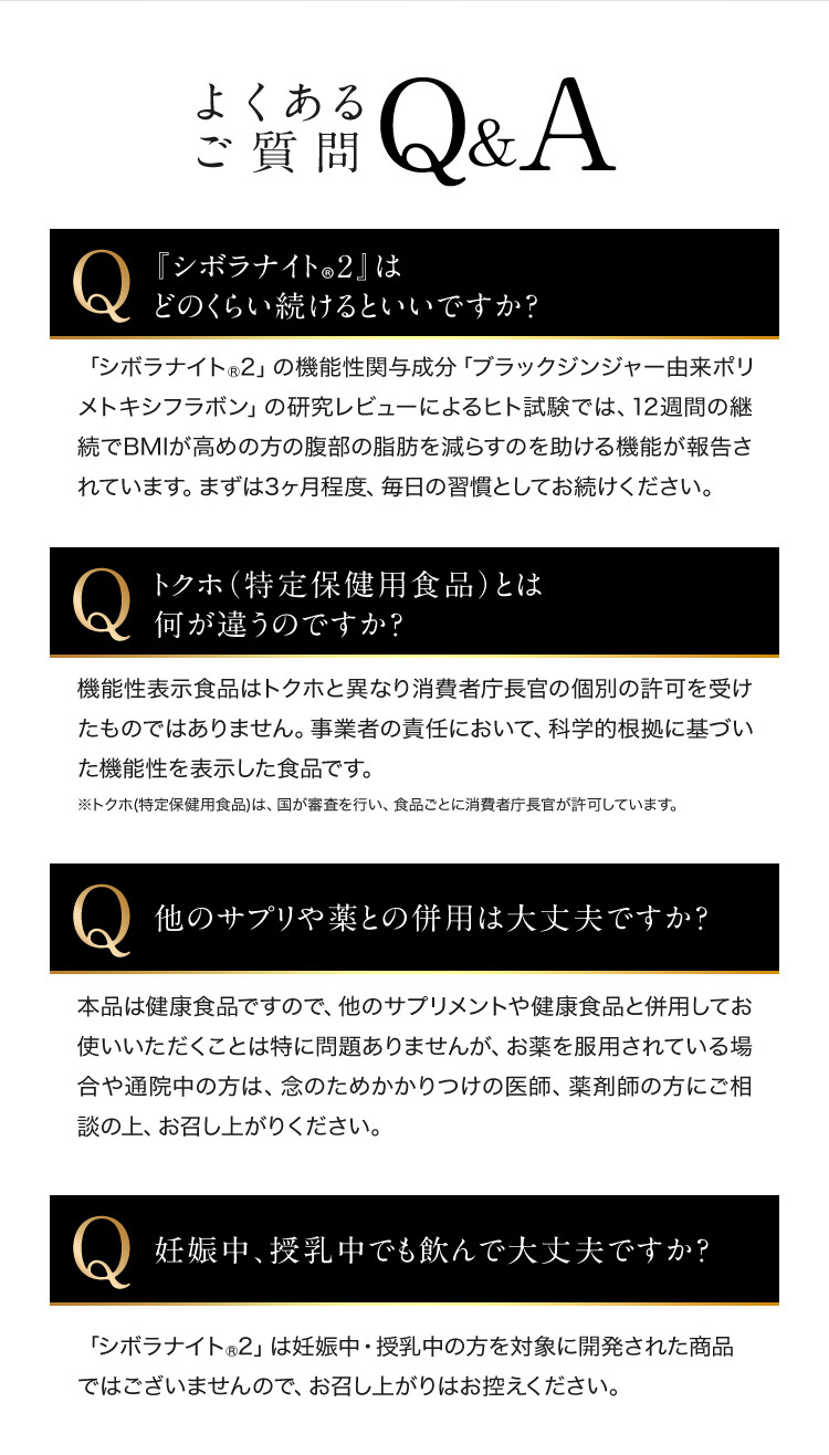 - ブラックジンジャーエキス(ブラックジンジャーエキス(国内製造)、デキストリン)、混合ハーブエキス(ドクダミ、セイヨウサンザシ、ローマンカモミール、ブドウ葉)、ギムネマシルベスタエキス、桜の花エキス/セルロース、シクロデキストリン、ステアリン酸Ca、微粒酸化ケイ素