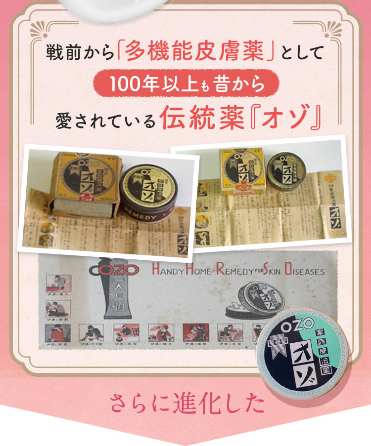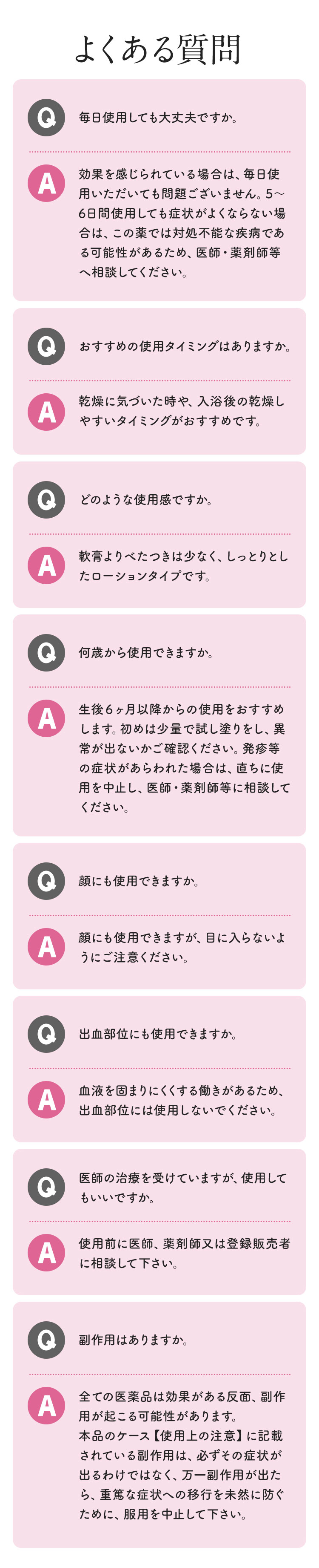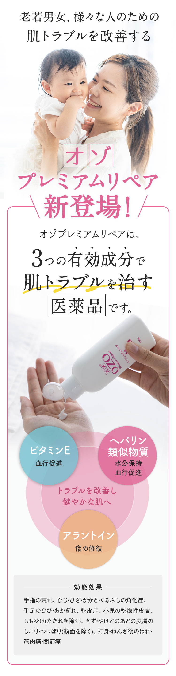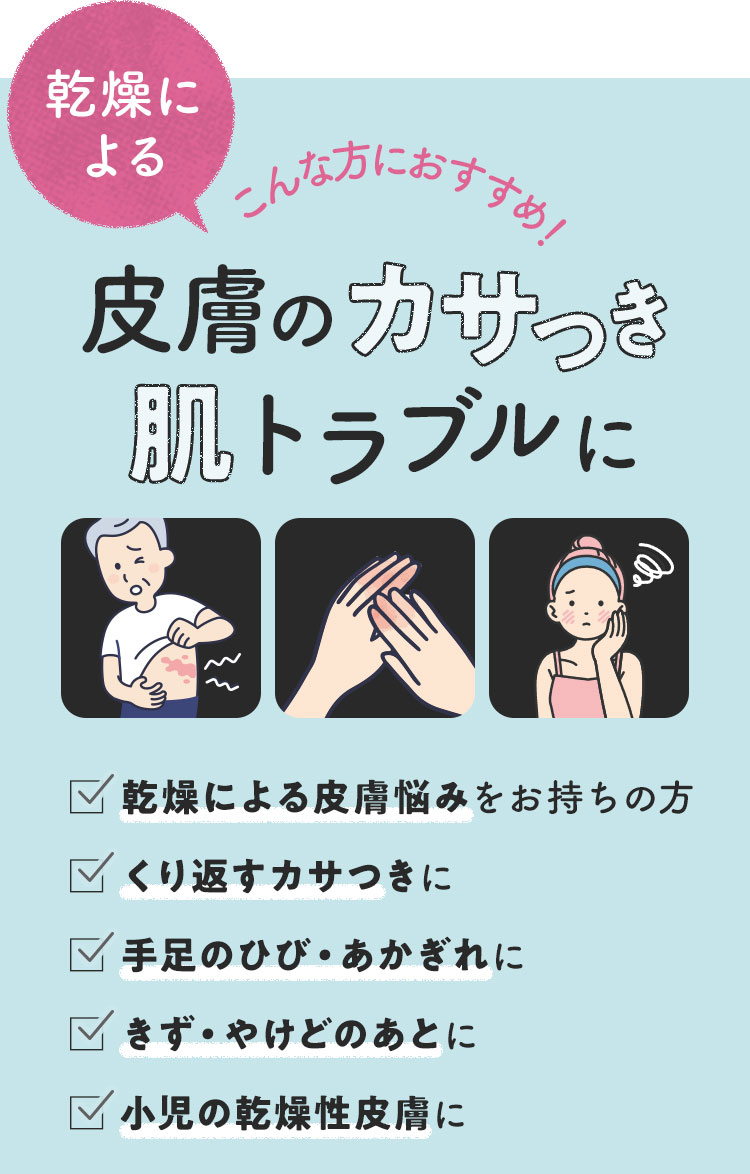 - 手指の荒れ、ひじ・ひざ・かかと・くるぶしの角化症、手足のひび・あかぎれ、乾皮症、小児の乾燥性皮膚、しもやけ(ただれを除く)、きず・やけどのあとの皮膚のしこり・つっぱり(顔面を除く)、打身・ねんざ後のはれ・筋肉痛・関節痛
